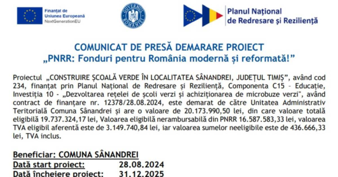 Într-o țară unde promisiunile sunt mai dese decât faptele, iată că se anunță cu surle și trâmbițe un nou proiect finanțat prin Planul Național de Redresare și Reziliență (PNRR). Comuna Sânandrei din județul Timiș devine, cel puțin pe hârtie, un pol al educației moderne, grație unui proiect de construire a unei „școli verzi”. Valoarea totală? Peste 20 de milioane de lei. Sună bine, nu-i așa? Dar să nu ne grăbim să aplaudăm.