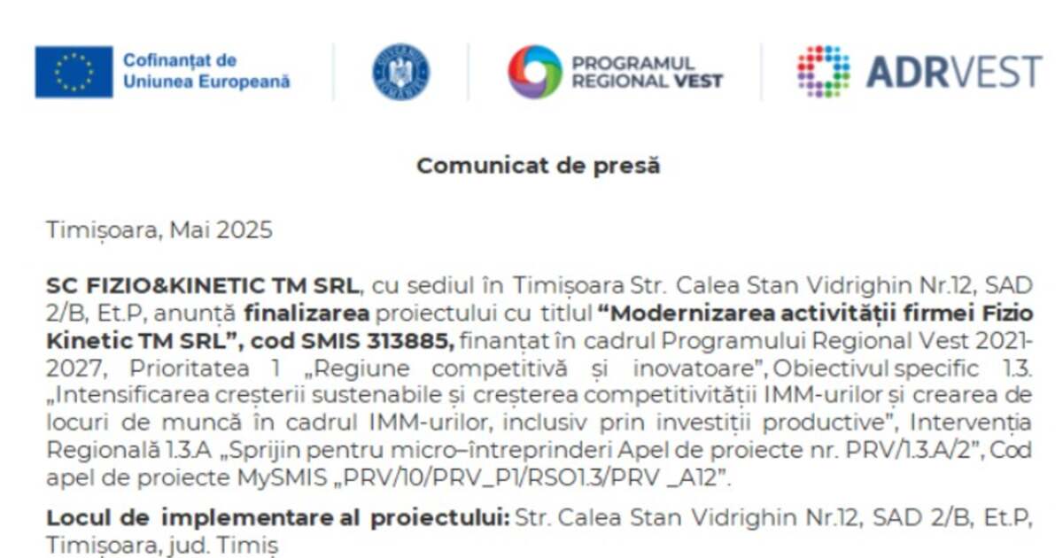 Într-o lume în care inovația și competitivitatea sunt cuvinte cheie, SC FIZIO&KINETIC TM SRL din Timișoara își anunță cu mândrie finalizarea proiectului “Modernizarea activității firmei Fizio Kinetic TM SRL”. Acest proiect, finanțat prin Programul Regional Vest 2021-2027, promite nu doar să îmbunătățească serviciile oferite, ci și să creeze locuri de muncă. Oare câte astfel de inițiative sunt doar o perdea de fum pentru a ascunde ineficiența sistemului nostru economic?